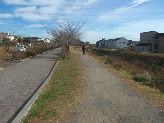 冬なのできれいでも何でもないですが、中央に並ぶのは思川桜の並木で、満開の景色はとってもきれい。左は運動公園に通じる歩道、そして右側が大根川です。