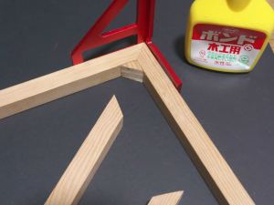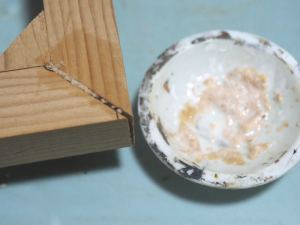 でも45°カットだなんてきれいにできるもんじゃない。こういうときにはカットしたときに出たおがくずを取っておいて、木工ボンドと一緒に練って隙間に詰める。