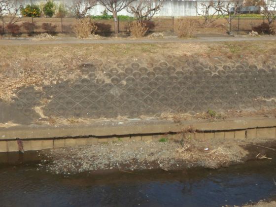 こちらは実際の風景です。土手斜面には突起のあるコンクリート板が使われています。突起は高さ3cmほど、1/64だと高さ0.5mmに相当します。