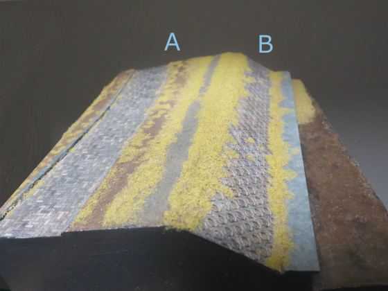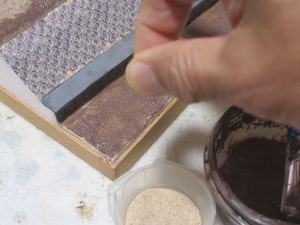 茶色に着色したモデリングペーストに「浴びっこサンド」混ぜ、水で薄めて下地塗料をつくります。そしてこれを塗って再度「浴びっこサンド」を撒きます。