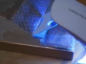 ポリプロピレンの梱包テープで縁をつくり、ベースとの境目に粘性の高いUVレジンを流して硬化させます。こうすれば透明レジンを次に流し込んだときの隙間漏れが起きません。