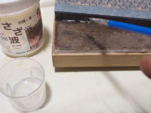 あとは隅っこの部分にところどころ水で薄めた木工ボンドを塗って、砂や茶色のパウダーを撒いて、土や葉っぱの汚れを表現します。