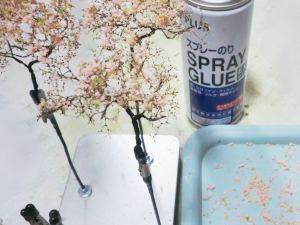 素材3は「桜の花」、市販品で出回っている粒子が1~2mmのものです。枝にスプレーのりを吹き付け、桜の花の素を上から撒きます。