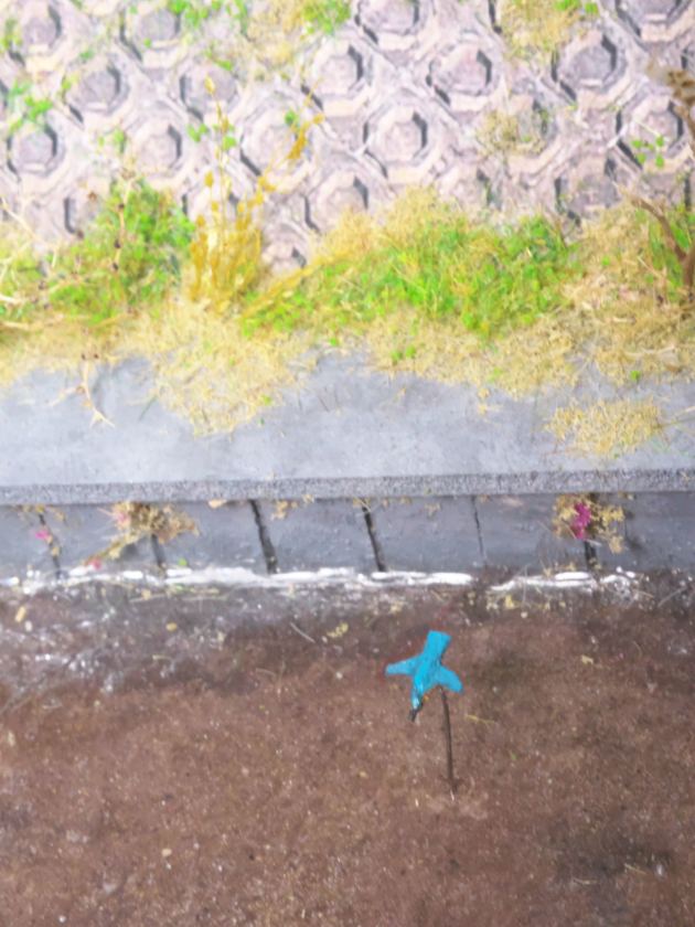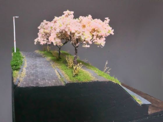 歩道沿いには芙蓉の木があるのですが、成長が早いので、冬場は全て切り取られて根っこだけになっている。モデリングペーストに伸ばしランナーを短く切ったものを押し込み、