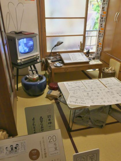 部屋のいくつかはこのように復元されていて、実際の漫画家たちの日常が分かるようになっています。こちらは漫画家・動物絵作家であり、トキワ荘最後の住人と言われる