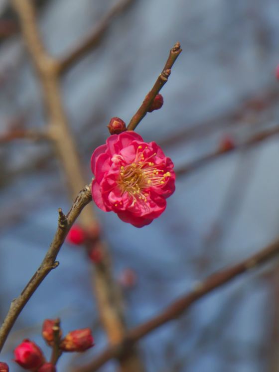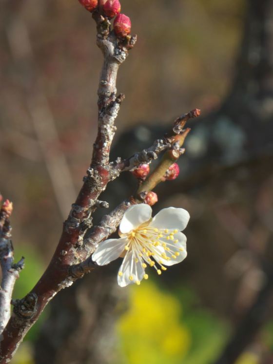 新春の頃、ロウバイはあと少しで満開。紅梅も数輪ですが、すでに咲いていました。