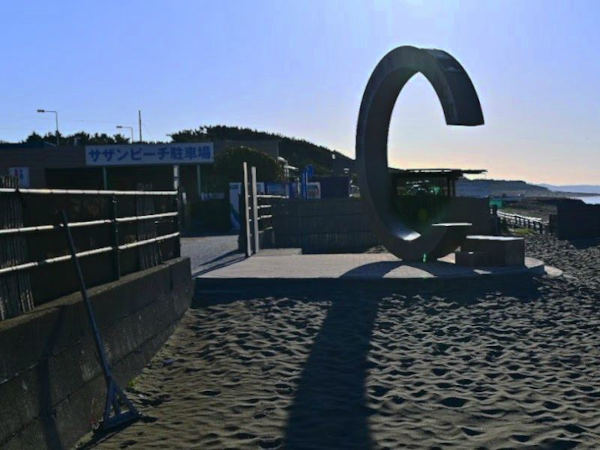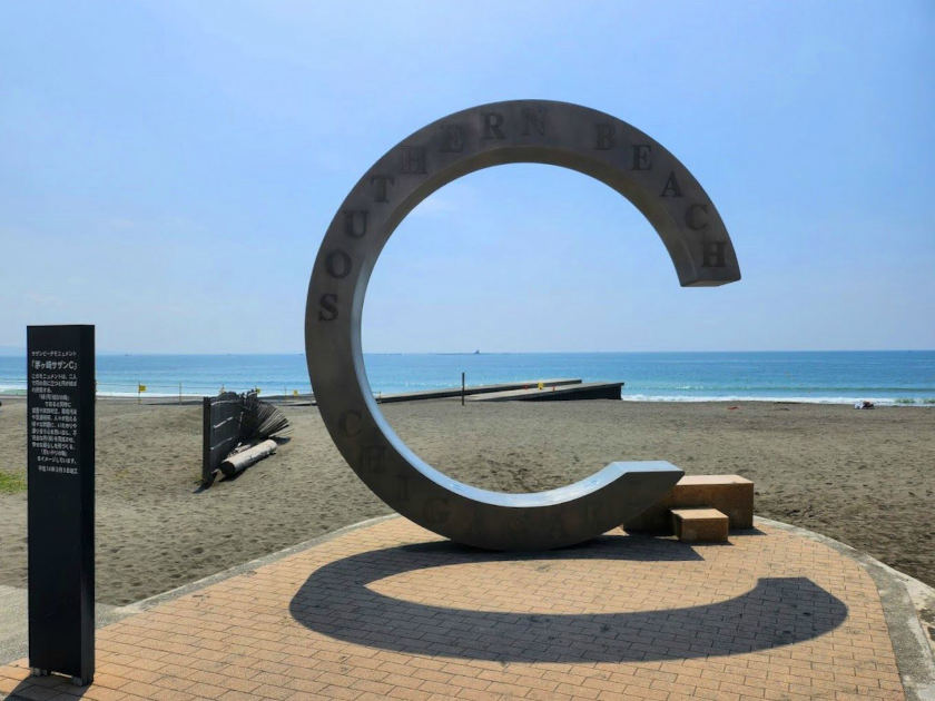 そして選んだ場所は、言わずと知れたサザンビーチちがさきです。海岸に降りてゆくところにはこの「C」のモニュメントがあるので、これさえあれば誰が何といおうと