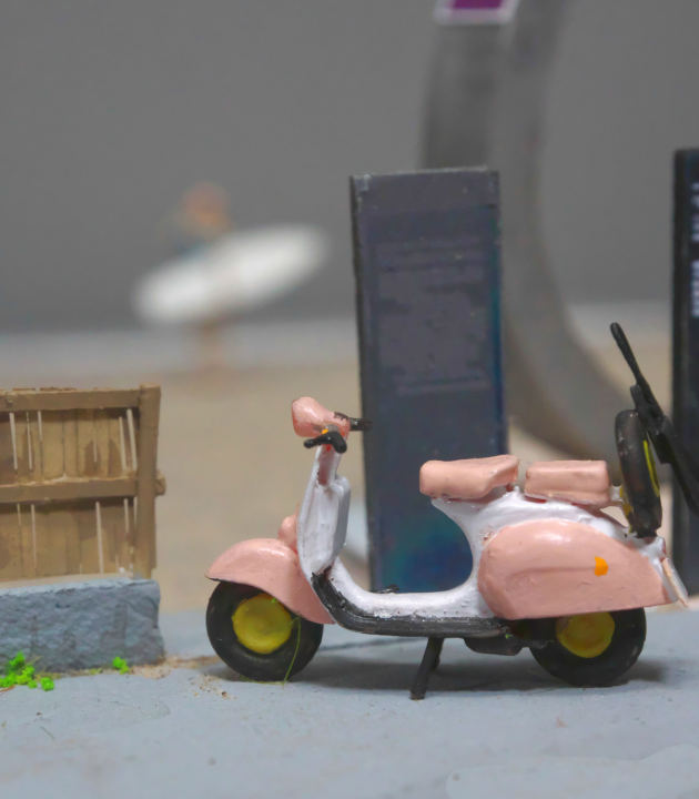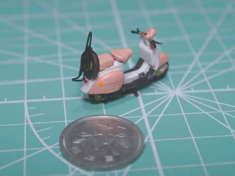身長28mmのフィギュアやスクーターなども、ちゃんと細かくつくり込んでいるのですが、これだけ小さいとさすがに分かってもらえない。作品展の際にはスマホで