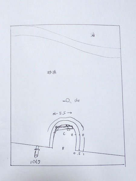 手前から駐輪場、砂浜、海、遠近感を出すためには縦長の配置の方が良い。バランスとしては砂浜をできる限り大きくとることで、ひろがりを感じさせる空間を作ります。