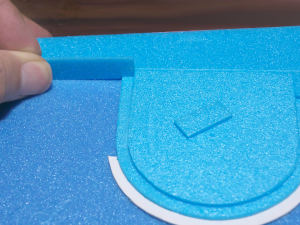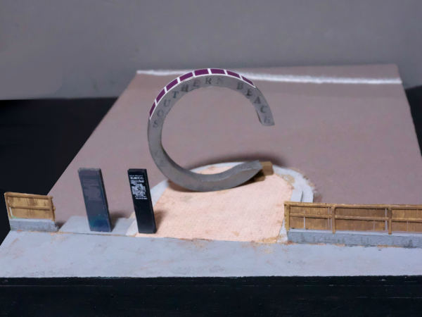 モニュメントの土台部分は砂浜に降りる階段になっているので、これを2mm厚のスチレンペーパーで表現します。半円形部分のカットはOLFAのサークルカッターを使うのが
