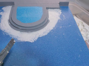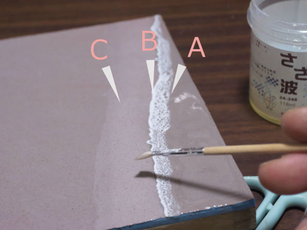 波シールは平坦なものなので、波が立っているような感じを出すために、波の扇端部分にモデリングペーストを置いて立体感を出します。(B)