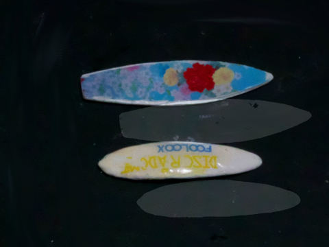 キットに付属していたサーフボードは下です。少し小さすぎるのと、反りすぎているのが問題で、結局上のようにプリンターで派手な画像を印刷してプラ板に貼り付けたものを