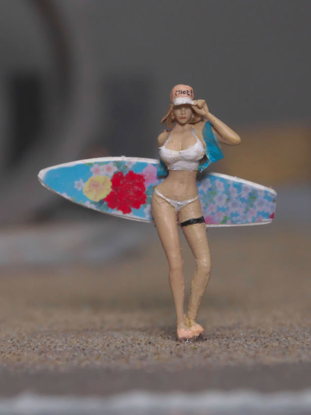 サーファーの彼女はTEMUで569円、スクーターの方はAliexpressで347円。1/64スケールなので身長は28mmしかないけど、3Dプリンターで制作されたこのフィギュアは