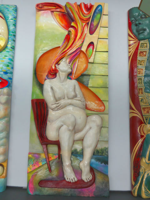 下の立体彫刻の一つをアップにするとこんな感じです。高さは4mほどもあって、2016年に岡本太郎賞の大賞を受賞した巨大壁画だそうです。
