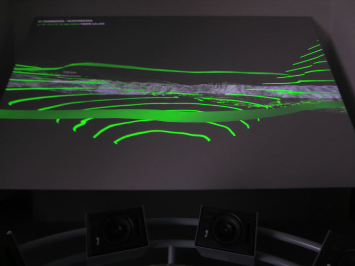 コントローラーを操作すると、等高線のような緑の発光が変わってゆく。この一帯の地形をあらわしているそうで、同時に音の響きも変わってゆく。