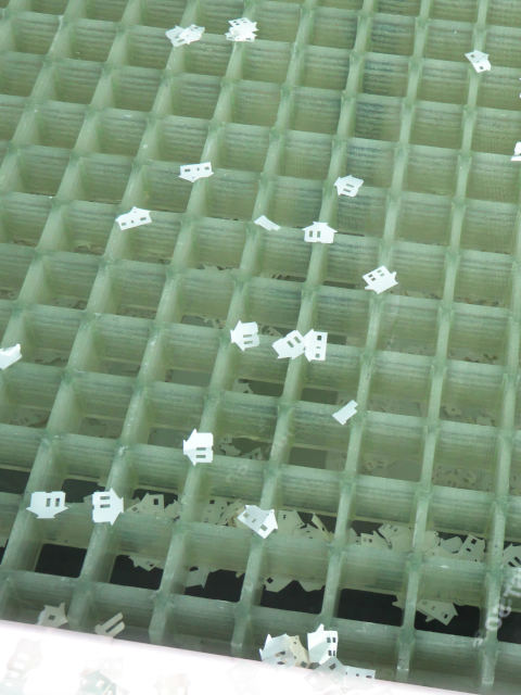 豪雪地帯の家屋と世界の都市の建物をかたどった紙が、ガラスケースの中で雪のように舞い降りる。