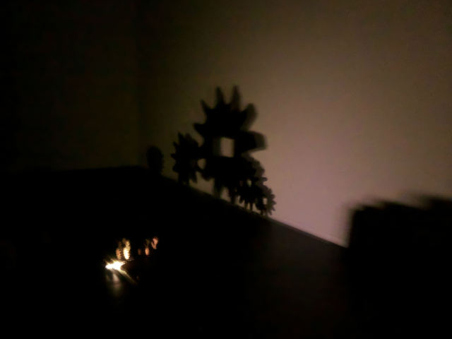 小さな鉄道模型にライトが仕組まれていて、そのライトに照らされて様々なものが壁に映る仕組みです。床に置かれているのは織機の部品だろうで、