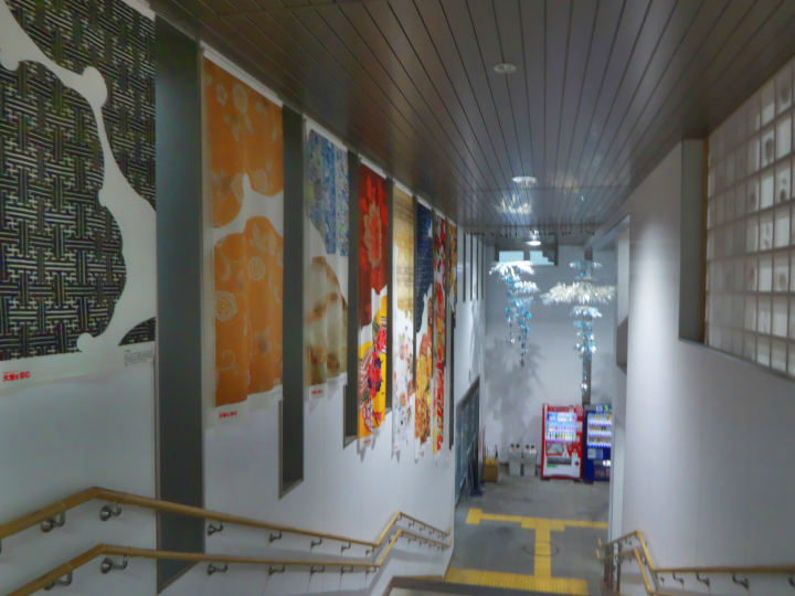 改札に続く階段には、十日町の誇る織物がいくつも展示されている。
