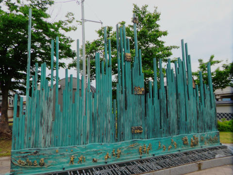 駅前の公園には近年の最大積雪量をあらわしたモニュメントがある。一本一本の緑のパイプが積雪量をあらわしていて、中には4m近い年もあった。すごいね。