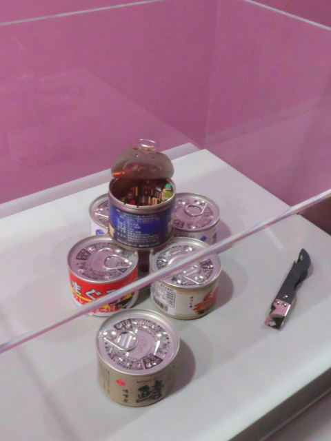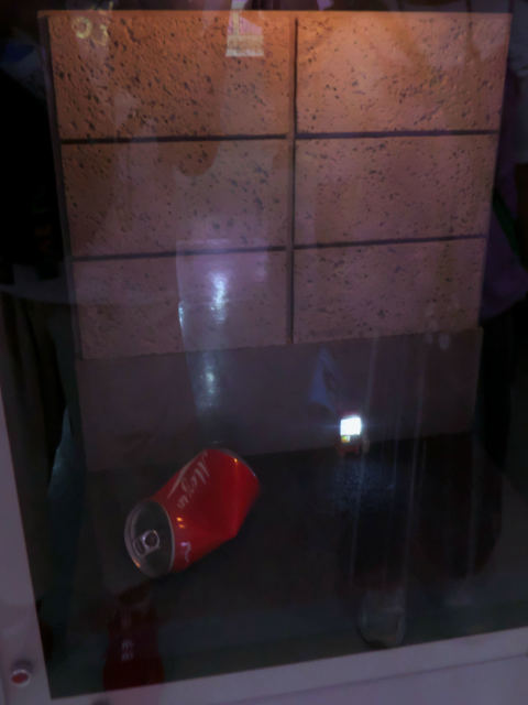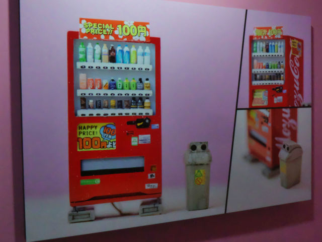 空き缶の横で輝いているのは、ミニチュアの自動販売機です、小さくてよくわからないので、拡大写真が展示してありました。