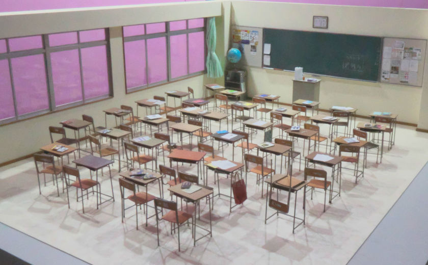 こちらは誰もいない教室、廊下側の一番後ろの人は欠席しているらしい。机の上に散乱するノートや教科書、雰囲気を察するに美術や理科の実験といった実技科目で、