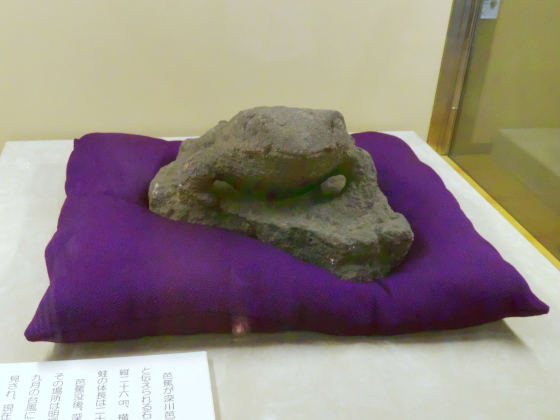 消失したと伝えられる庵跡から見つかった石のカエル、芭蕉本人もお気に入りだったとか。