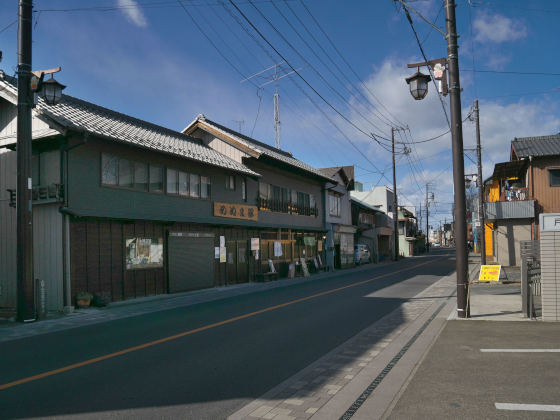 聖天山の参道に沿って東西に延びる道は「縁結び通り」といって、レトロ感あふれる通りです。左のお店は「さわた」という大福茶屋、甘味の他に定食などもいただける